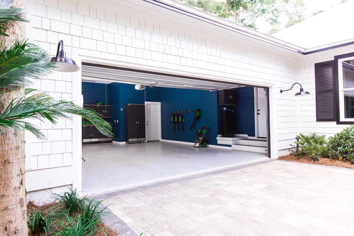 白い壁が美しい家と電動シャッター付きのガレージ。このガレージ内だけで暮らせそう!?