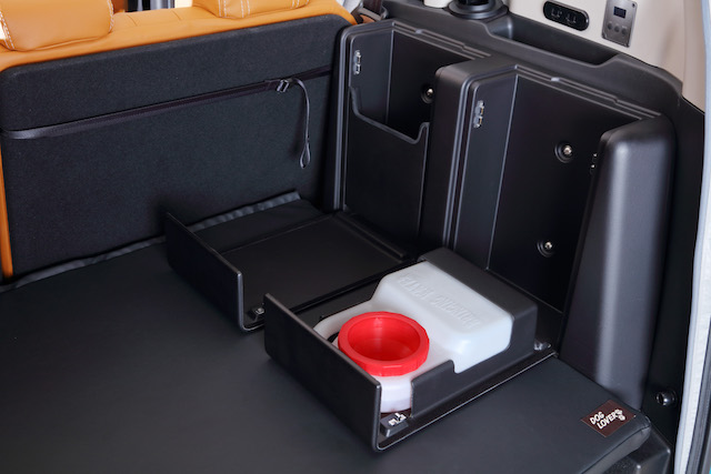 これは犬といっしょの生活を、より楽しめるよう工夫されたキャンパーだ。ホワイトハウスがフリード+をベースに、ポップアップルーフやサブバッテリー、エアヒーターなど車中泊などを快適に過ごせるように仕上げたキャンパー「フリースタイル」をベースに、ホンダアクセスの持つノウハウからドッグファンのニーズを満たすアイテムをプラスしたのが、「ドッグラバー」というわけだ。