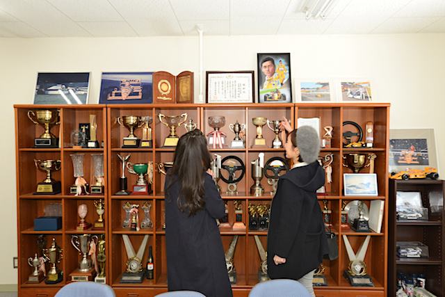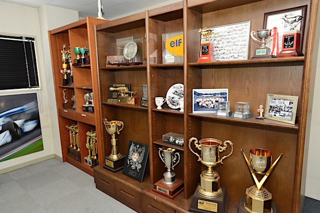 廊下の広間には、松浦選手とバゲット選手が獲得した今年の鈴鹿1000km優勝トロフィーをはじめ、NAKAJIMA RACINGの歴史を刻んだカップや盾が燦然と並べられていました。かつてフォーミュラ・ニッポンでタイトルを獲得したときの集合写真を見たリアちゃんが「平野さん、わっかーい!!」と言ってはしゃいだのはナイショです。