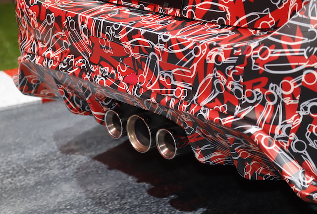 変更されたのはテールエンドで、同じ3本出しながらFK8の場合は左右ふたつの太いマフラーがメインで、中央はレゾネーターと呼ばれるサウンドの迫力向上のための部品だった。いっぽう今回のプロトタイプでは、中央部分が太くなっており、まったく逆転の配置となっている。