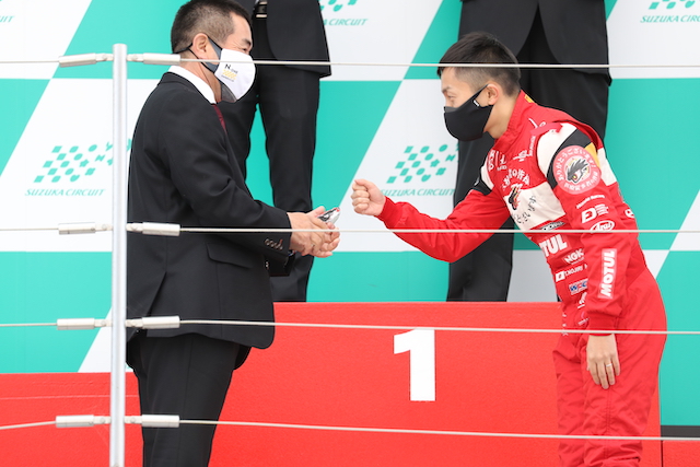 プレゼンターは、2021年シーズンの全日本スーパーフォーミュラ選手権でドライバーズチャンピオンに輝いた、TEAM MUGENの野尻智紀選手が担当。選手それぞれへ表彰を行い、グータッチで祝福を行った。