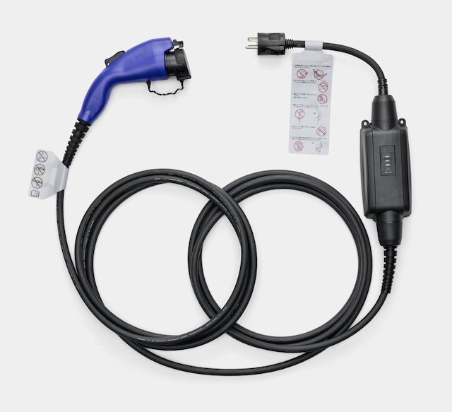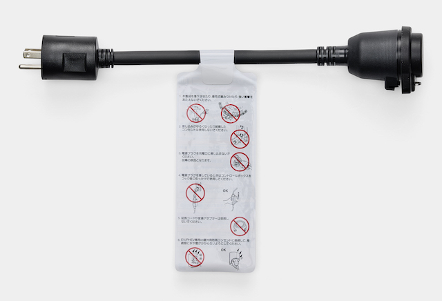 緊急時の電欠対策のお守りとして、車載しておきたいのが「充電ケーブル 100V充電用アダプター」だ。外出先などで200Vの電源が取れない場合に、充電ケーブルの電源プラグコードをこのアダプターに交換することによって、100V電源でも充電できるようになる。