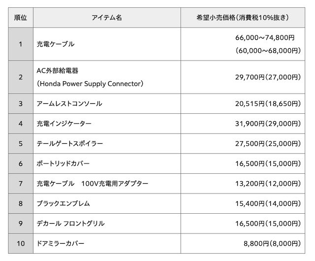 【ホンダアクセス】軽EVのN-ONE e: 用純正アクセサリーの人気ランキングを発表! 充電・給電に関するアイテムが上位に