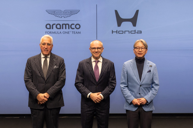 発表会には、ホンダの代表執行役社長である三部 敏宏氏、Formula One Group(フォーミュラワングループ)President & CEO of Formula 1のステファノ・ドメニカリ氏、Aston Martin Aramco Formula One Team Executive Chairmanのローレンス・ストロール氏が登壇してスピーチを行った。