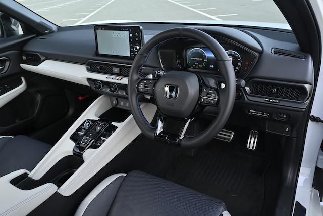 そして「スペック3」ボディキット以外も、無限は多くのプレリュード用パーツをラインナップしているが、今回の取材車両である新型プレリュード「スペック3」ボディキット装着車には、現在開発中のスポーツステアリングホイールが装着されていた。外装と同じくカーボン素材をグリップ部分に用い、さらにブルーステッチが採用されている。