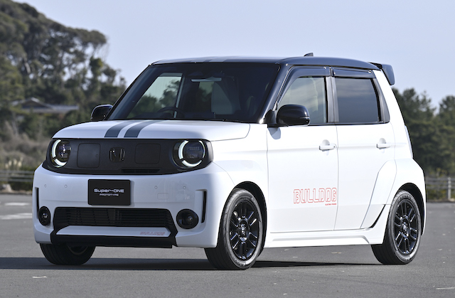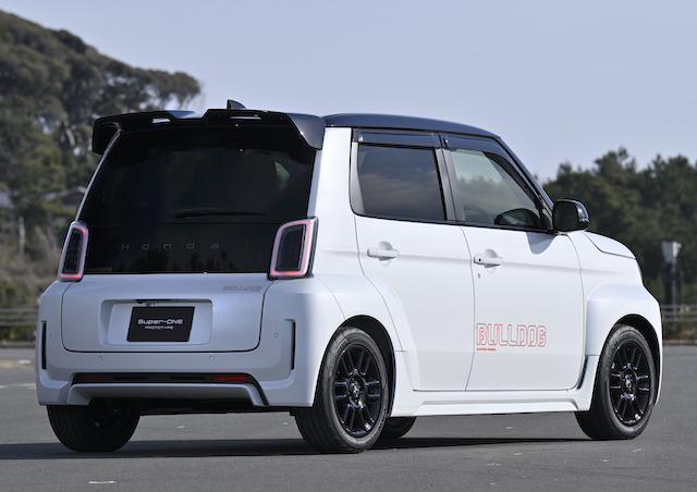 まずはホンダアクセスが手掛けた「Super ONE」だが、なんといっても特徴的なのは左右フロントドアやフロントバンパー下部、そしてテールゲートに配された見える『BULL DOG』ロゴだろう。もちろんこれは、1983年に登場したシティ・ターボⅡの愛称をオマージュしたもの。
