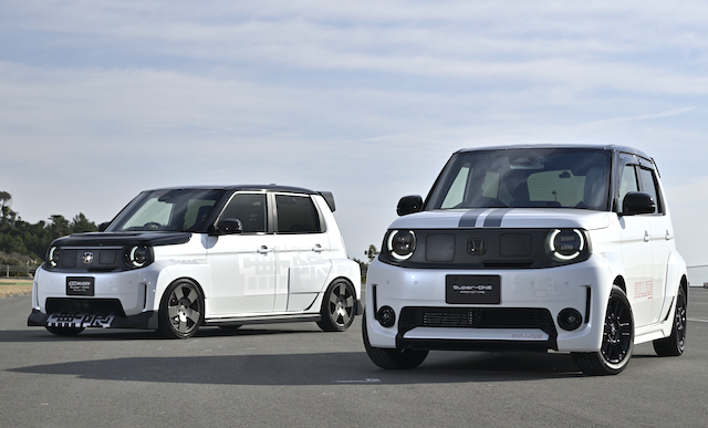 まずはホンダアクセスが手掛けた「Super ONE」だが、なんといっても特徴的なのは左右フロントドアやフロントバンパー下部、そしてテールゲートに配された見える『BULL DOG』ロゴだろう。もちろんこれは、1983年に登場したシティ・ターボⅡの愛称をオマージュしたもの。
