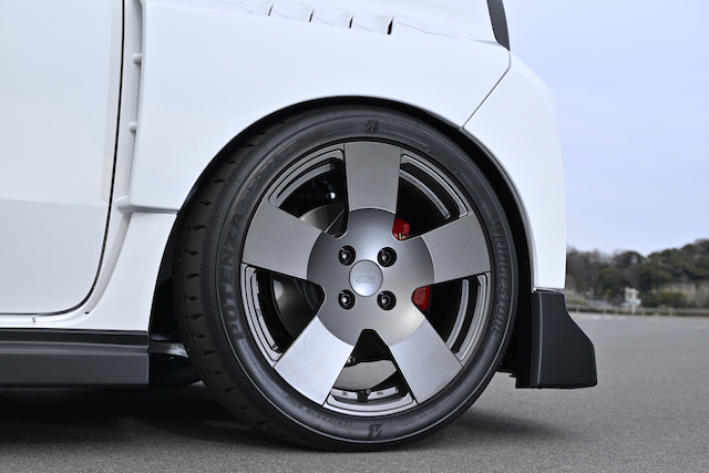 この16インチホイールのサイズは未発表ながら、タイヤはフロントに195/45R16、リアは205/45R16サイズのブリヂストン RE-71RSを装着している。ブリヂストンの高性能スポーツタイヤを組み合わせることからも、Super ONEの持つ高い運動性能が想像できる。