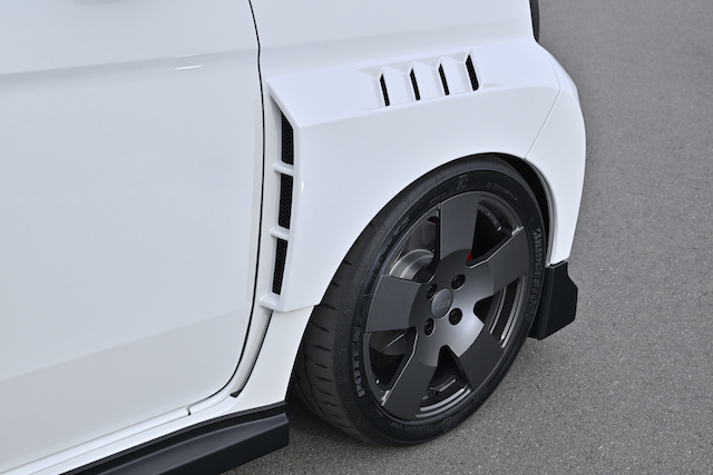 フロントフェンダーは新規に設計された交換タイプで、上部および後方にエアアウトレットを備えた形状となっている。いっぽうリアフェンダーは純正のフォルムを活かしつつ、リアドアに追加パーツを組み合わせることでブリスター形状とした。