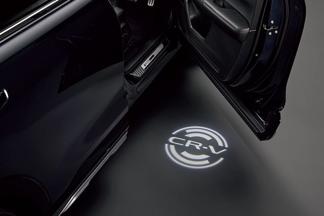 インテリアには、上質さを演出するイルミネーションアイテムをラインアップ。乗り込むたびに「CR-V」のロゴが路面に浮かび上がり、所有する喜びを感じられる「パターンプロジェクター」をはじめ、ドア開閉に連動してステンレスプレート内の「CR-V」ロゴが点灯する「サイドステップガーニッシュ」が設定される。